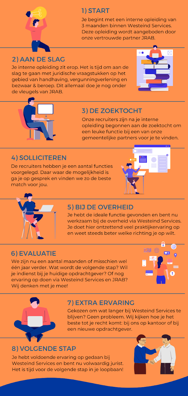 Wij richten ons met onze interne opleiding op afgestudeerde rechtenstudenten. Bij ons doorloop je dan een traject van ongeveer 3 maanden. Hierin word je door onze senior partner met meer dan 23 jaar ervaring in het omgevingsrecht of door een medior jurist (intern) meegenomen in hun werk. Hierdoor ga je op een praktische manier aan de slag met juridische vraagstukken op het gebied van handhaving, vergunningverlening en bezwaar en beroep. Na dit interne traject bieden wij jou de mogelijkheid om bij een van onze gemeentelijke partners ervaring op te doen in de bovengenoemde gebieden. Dit traject duurt één jaar en 9 maanden waardoor je in een relatief korte periode in verschillende keukens hebt kunnen rondkijken. Na dit traject weet je wat goed bij je past en wat misschien minder. Het gehele traject duurt dus twee jaar. Hierna ben je als volwaardig jurist klaar voor een volgende stap of ligt er wellicht een begeleidende rol voor jou in het verschiet!